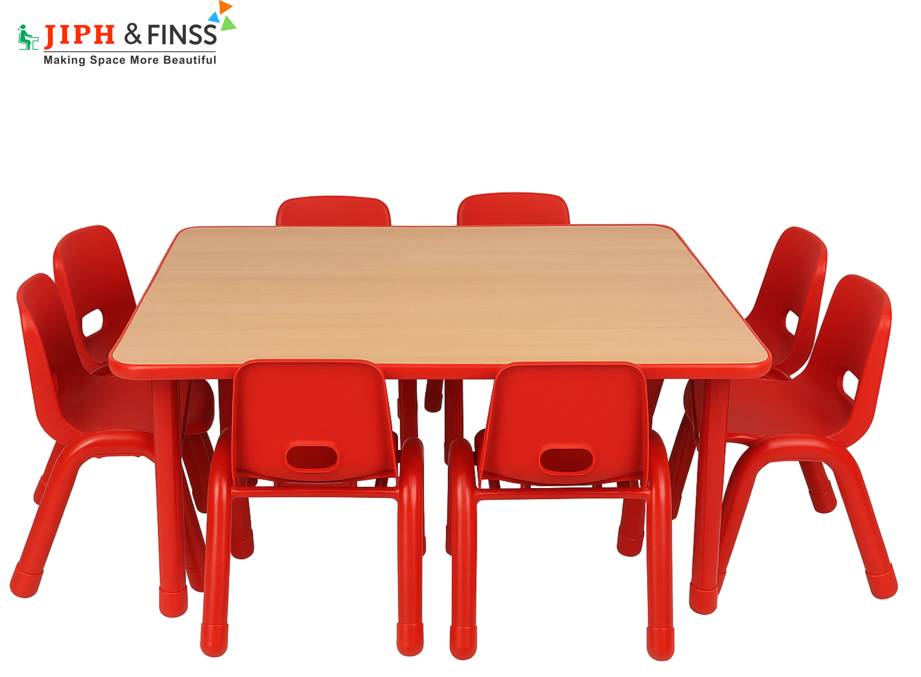 The Hexa-3 Kids Education Furniture Set features a strong square table with six ergonomic red chairs.